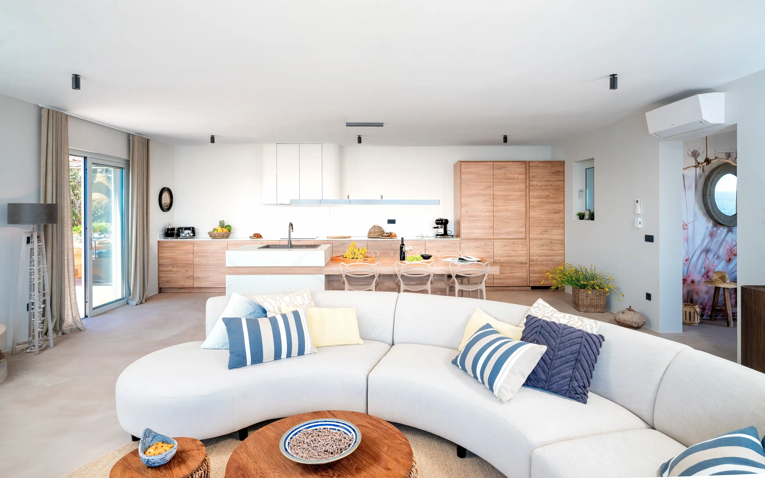 This first-row-to-the-sea villa is set in a peaceful residential area, surrounded by lush Mediterranean greenery and offering direct access to a serene coastal lifestyle. The open-concept living area features elegant furnishings, a fireplace, and expansive sea views, seamlessly connecting to a dining area and a fully equipped modern kitchen.